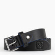 Cette élégante ceinture noire pour homme est une pièce sobre et originale à la fois. Facile à porter, elle possède un marquage embossé ton sur ton et les contours en bleu discret et légèrement électrique.