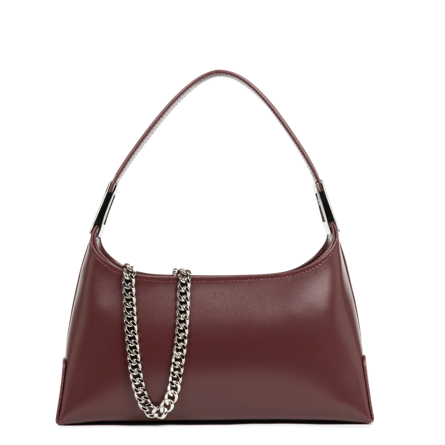 Ce petit sac baguette comporte une grande poche intérieure avec une chaîne métallique. Il se porte à la main, à l'épaule ou croisé.