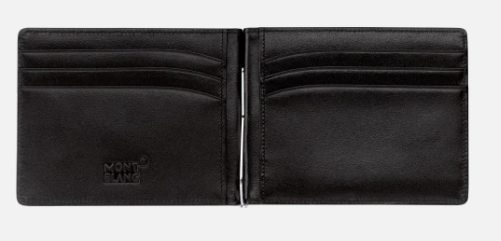 Portefeuille 6cc avec pince à billets en cuir de veau pleine fleur européen noir, lustre Montblanc exceptionnel, doublure jacquard ornée du nom Montblanc, emblème Montblanc entouré d'un anneau palladié ; avec 6 emplacements pour les cartes de crédit, pince à billets