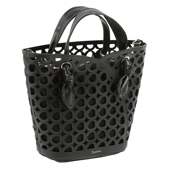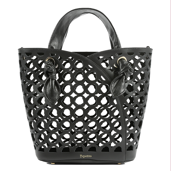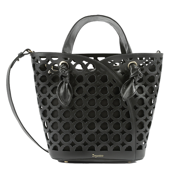 Le sac en cuir repetto de la ligne Révérence est la réinterprétation du panier de Brigitte Bardot. Le jeu des deux panneaux juxtaposés rappelle le croisé du cache-cœur d’une danseuse. Les poignées amovibles renforcent cette idée en offrant une grande liberté de personnalisation. Elles deviennent réglables selon les envies et la hauteur du nœud réalisé, qui lui peut être soit à l'extérieur, soit à l'intérieur du sac. Repetto a développé sa propre perforation, reprenant le O de notre logo, toujours en mouvement.